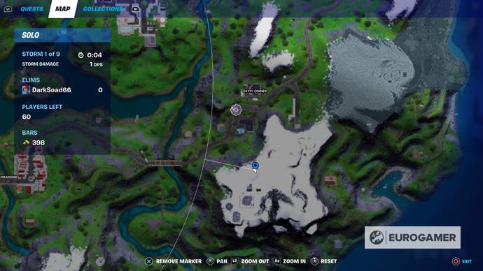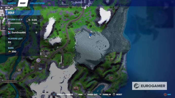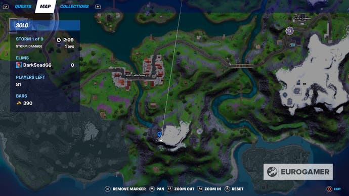 Beginnen Sie nun, in Richtung Catty Corner zu bewegen. Sie finden einen weiteren Platzierungsort nördlich der Basis am Berggipfel, kurz vor der Klippe. Wenn Sie sich die Karte ansehen, ist sie mit dem ‘Co’ von ‘Corner’ übereinstimmt.