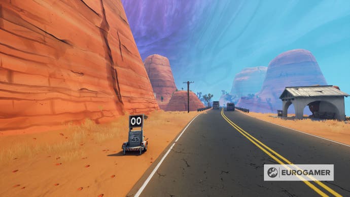 D8 – silnice mezi továrnou Flush a Shifty Shafters, obří židlí