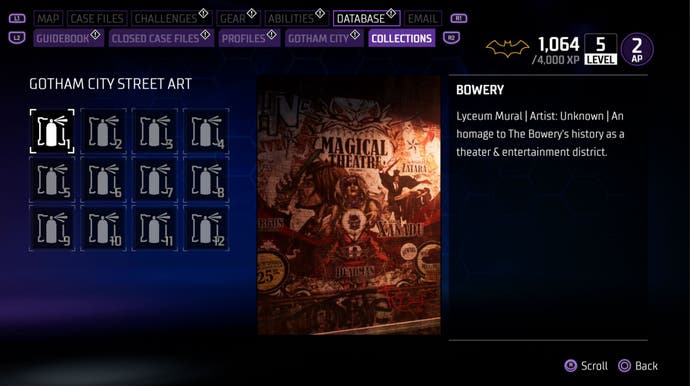 Veškeré pouliční umění, které jste našli, spolu s jeho příběhem, si můžete prohlédnout v části Collection v databázi, což je pěkný způsob, jak sledovat Batman Lore v Gotham Knights.